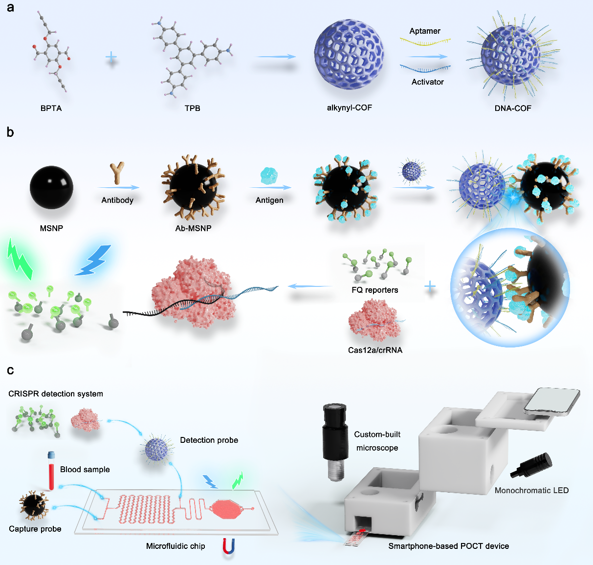 COCAS平台的核心是利用共价有机框架材料同时修饰靶向目标蛋白的适配体和大量CRISPR-Cas12a系统的激活链。当目标生物标志物存在时,形成“抗体-蛋白-适配体”复合物,将低丰度的蛋白信号转化为大量核酸激活链,完成第一级信号放大。这些激活链随后启动CRISPR-Cas12a系统的反式切割活性,无差别切割荧光报告分子,产生第二级信号放大,从而实现超高灵敏度检测。