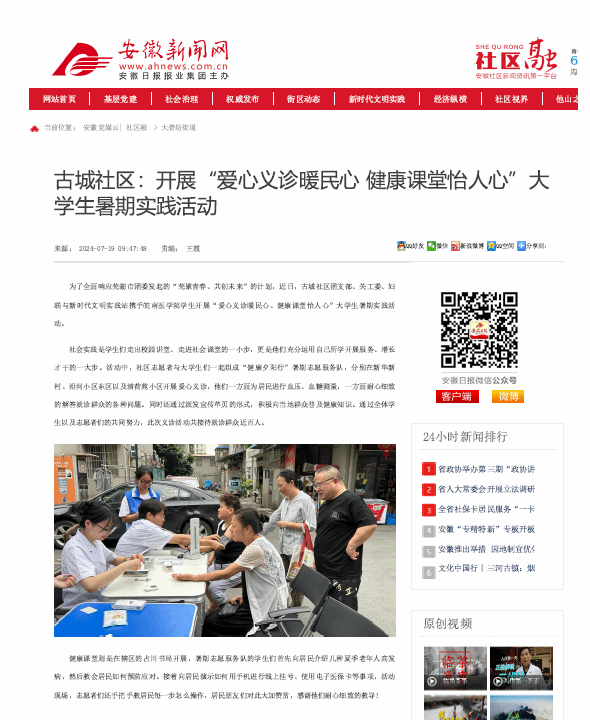 情暖古城,义诊服务送健康。7月16日至18日,志愿服务队走进古城社区,开展了一系列便民利民的义诊服务。三天时间里,志愿者们利用所学医学知识,为社区居民提供了血压、血糖测量等基础医疗服务,不仅耐心细致地为居民进行各项检查,还针对检查结果给出专业的健康建议。对于居民们提出的各种健康问题,志愿者们都认真倾听,详细解答,赢得了社区居民的一致好评。此次义诊活动不仅为社区居民带来了实实在在的健康福利,也架起了医疗资源与基层群众之间的桥梁。许多平时因各种原因无法及时就医的居民,通过这次活动得到了及时的健康指导,大大提高了自身的健康管理意识。