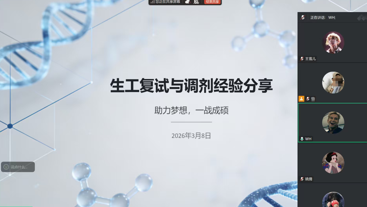 为切实助力2022级生物医学工程专业考研学子攻克复试难关、科学规划调剂路径,近日,学院特邀2025届考入安徽工程大学的姚倩、上海理工大学的魏豪,以及盐城工学院的潘瑞三位优秀毕业生,在线上开展 “助力梦想,一战成硕” 考研复试经验分享交流会,为备考学子量身定制复试与调剂实战指南。