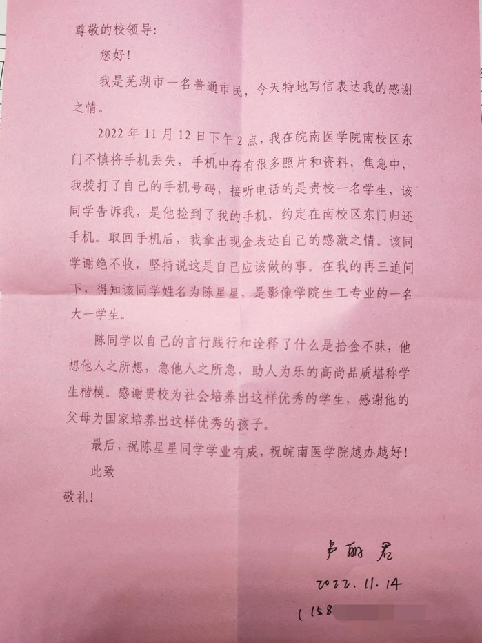 人间有爱,处处留馨。2022年11月14日,15vip太阳集团官网收到了一封来自芜湖市普通市民卢丽君女士的感谢信,对学院2022级生物医学工程专业的陈星星同学拾金不昧的行为,进行了由衷的感谢与赞赏。
