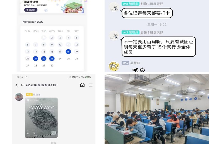 为了帮助大一新生初次参加四级考试,提高四级通过率,学院组织开展英语四级模拟考试,帮助同学了解四级题型,熟悉考试流程。同时,为了培养同学坚持的习惯,提高同学的英语水平,激发同学学习英语的兴趣,2022级团总支员工会发起每天背单词打卡活动,各班同学积极参与。