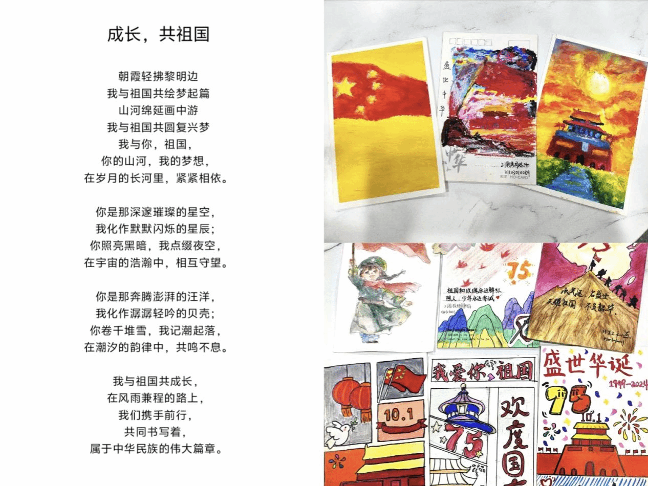 文字潺潺流淌,细述时代之发展;色彩缤纷织梦,共绘祖国之辉煌。正逢中华人民共和国成立75周年,同学们纷纷投来自己的作品,他们以文字为载体于文章中尽情挥洒爱国情怀,用斑斓的色彩在明信片上细腻描绘出祖国七十五载辉煌历程中的伟大变迁。七十五年来风雨兼程,同学们真切地感受到新时代青年生逢其时,大有可为。