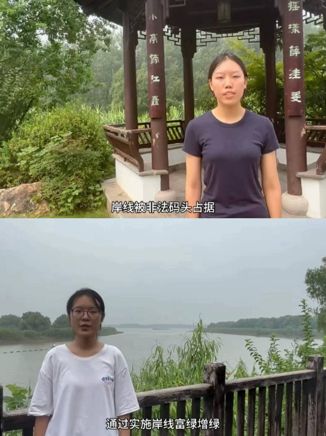 实践团以“第一视角”拍摄薛家洼短视频,在抖音平台发布。镜头中有生态标语的特写,聚焦薛家洼岸线“十年禁渔 守护江豚”等标语牌,结合队员的讲解,解读标语背后的生态政策,让“纸面要求”变成“可感知的行动指引”。在实践团拍摄的镜头中,我们可以看到清晨的江滩,没有垃圾,水质良好,午后湿地植被生长,白鹭栖息、小鱼洄游画面,真实呈现“生态保护不是口号,是日复一日的坚守”。