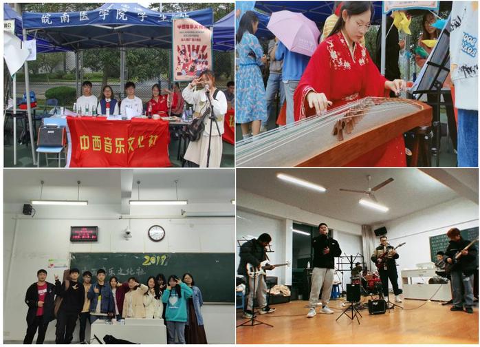 中西音乐文化社拥有两支朝气蓬勃的乐队。2020级“铂引力”乐队以作品《社会主义好》应邀参加临床医学院晚会、以作品《旗开得胜》应邀参加校艺术展演、社团草坪演出等,在每一次表演中都留下了热爱与不凡。2021级“多巴胺”乐队是新鲜且热烈的,在充满梦的年纪,将以更优秀的作品呈现更多精彩。在校园的文化氛围里,两支优秀乐队通过中西两种乐器相结合的方式,不仅将优美旋律传播校园,更传递传着正确的文化价值观,以音乐文化为本,客观审视外来音乐,取其精华,弃其糟粕,促进自身音乐文化传统的发展。