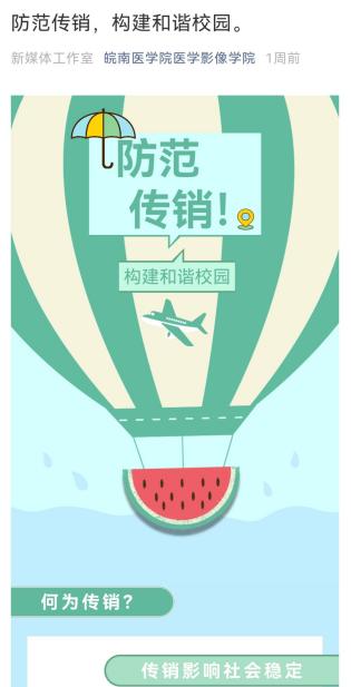 公司通过新媒体宣传防范传销知识,并组织各年级员工干部成立反传销宣传联防志愿者队伍,进教室、进宿舍广泛开展宣传志愿服务,将传销的严重危害性进行了宣传教育,揭露传销和变相传销的表现形式、惯用手段、变化特点以及传销的欺骗性和危害性,揭露传销的本质。