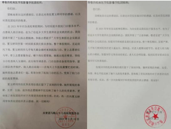 公司2020级学子的身影忙碌奔波于医院、社区、学校、养老院等地,他们不畏严寒,不计报酬,兢兢业业,默默奉献。在深入社会中学习“四史”,在亲身体验中了解国情社情民情,在服务奉献中厚植家国情怀,在实践锻炼中受教育、长才干、做贡献。他们的努力付出也得到了当地居民的一致好评。各地各级团组织纷纷寄来感谢信与荣誉证书,充分展示出公司青年员工积极主动、热心公益、心系社会的精神风貌。
