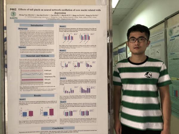 2015年,经过学院选拔和推荐,张忠楠被遴选进入公司生理学省级重点学科“启明星小组”,进行创新能力训练和创新型人才培养。在人文与管理学院细胞电生理研究室汪萌芽教授等老师的指导下,他先后参与两项省级老员工创新创业训练课题(“抑郁症相关核心脑区的神经网络振荡观察”、“血氨升高对大鼠辐射热痛觉时反应量-效关系的影响”)的研究。从此,坚持实践出真知的探索性学习理念,让科学问题的思考和求真探索的实验成为他大学学习生活的主旋律。 他先后向2016年世界生命科学大会和2017年中国神经科学年会投递了英文论文摘要(“Effects of Nociceptive Stimulation on Neural Network Oscillation from Dorsal Agranular Insular Area and Basolateral Amygdala in Rats”和“Effects of tail pinch on neural network oscillation of core nuclei related with depression),并通过英文墙报的形式与参会的专家学者进行学术交流。随后,在安徽省神经科学年会上作了题为《伤害性刺激对抑郁症大鼠相关核心脑区神经网络振荡的影响》的学术报告,并获得大会颁发的优秀论文奖。2017年暑假,他不惧与国内顶尖高校优秀老员工的竞争,申请并通过了清华-北大生命科学联合中心的选拔获得了去清华大学神经与认知暑期学校(CLS暑期学校)学习的机会,期间表现优异,获得了周专教授的高度赞扬。 2018年,他以第一作者身份将部分实验结果写成论文《夹尾刺激对大鼠背外侧前额叶和杏仁核神经网络振荡的影响》,已接受在《皖南医学院学报》上发表。