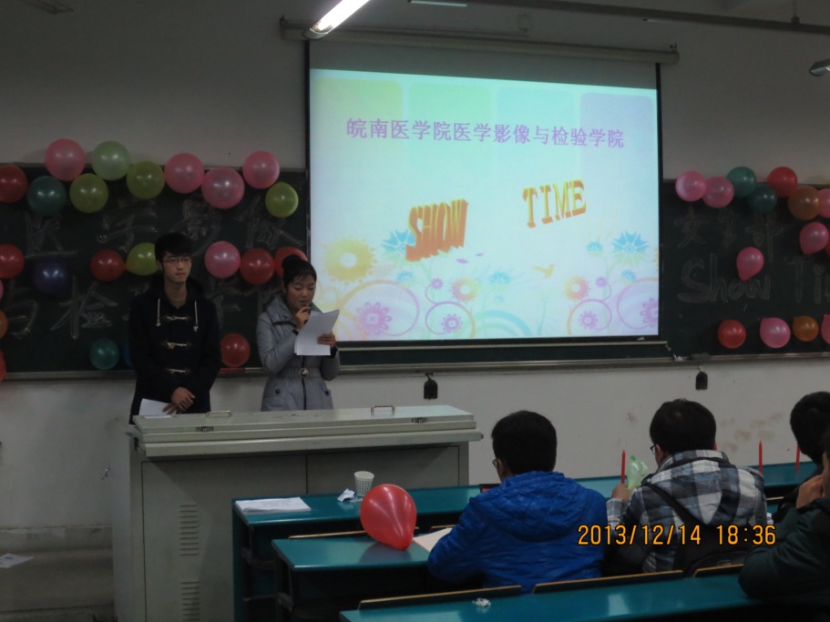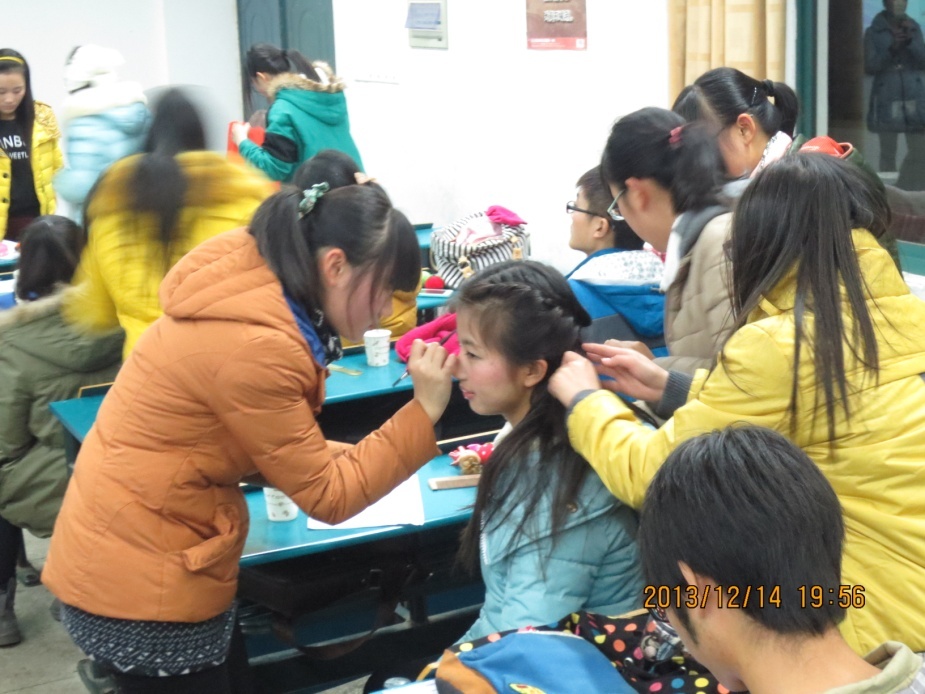 | 为丰富员工的课余生活,让同学们在紧张的考试月来临之前缓解压力,医学影像与检验学院团总支员工会于2013年12月14日晚在西教202教室举办了主题为“张扬青春个性,展现青春风采”的化妆晚会。