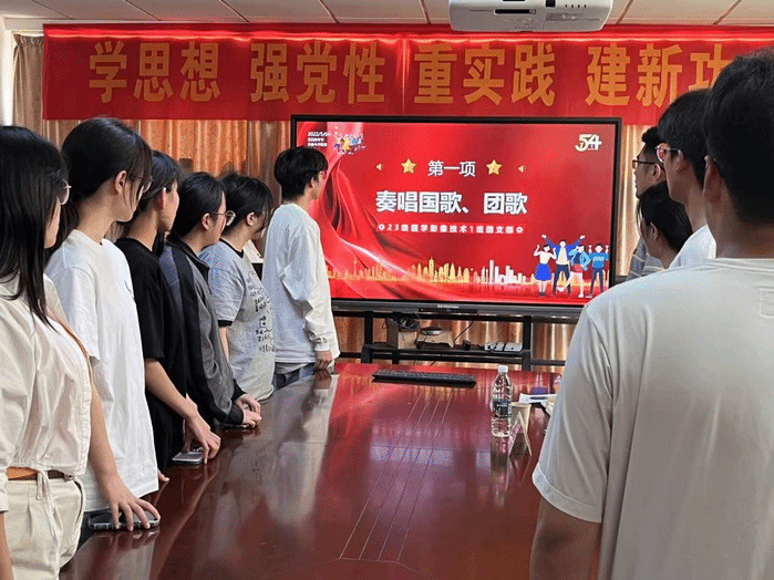 本次主题团日活动分为齐唱国歌团歌、深入学习五四寄语精神、团员宣誓、学习心得分享等环节。