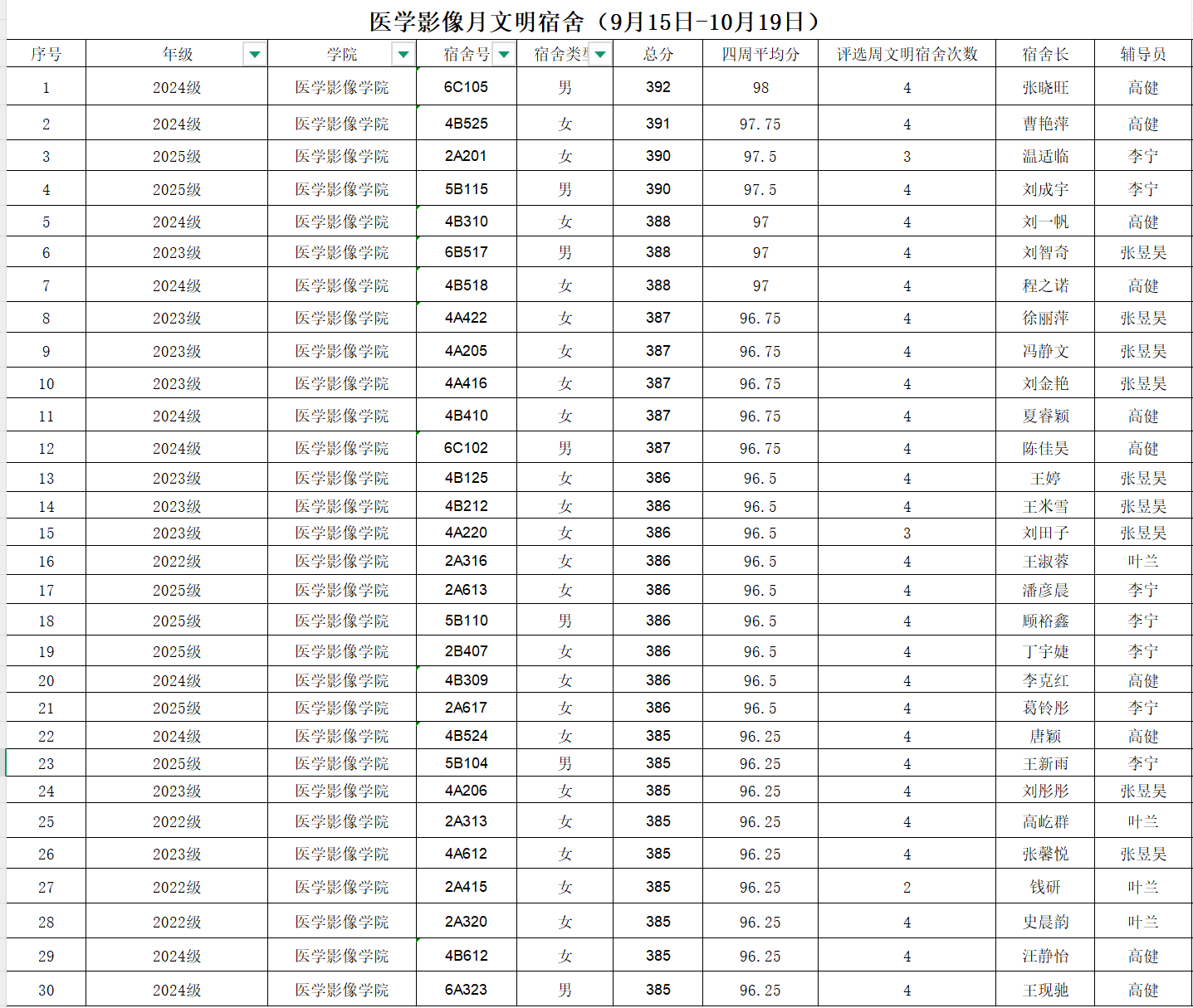 据《皖南医学院“安全文明宿舍”评选办法 (修订)》和《15vip太阳集团官网文明宿舍评选实施细则》文件要求及评选标准,共评选30间“月文明宿舍”,现进行公示。