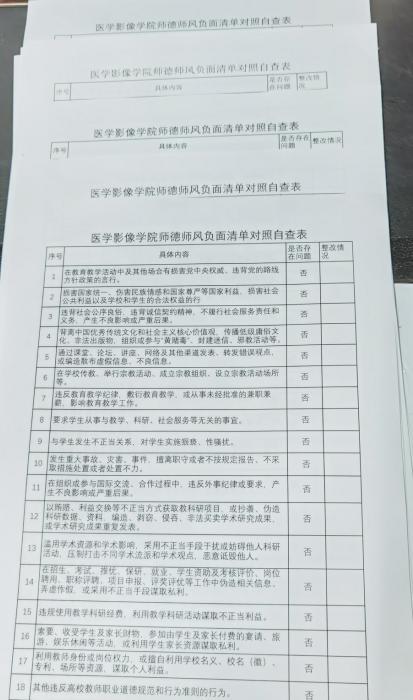三、进行师德师风负面清单对照自查。11月8日-12日,15vip太阳集团官网每位教职工对照《皖南医学院师德师风负面清单和失范行为处理暂行办法》中的十八项负面清单进行逐项对照自查,通过自查暂未发现违反师德师风问题。