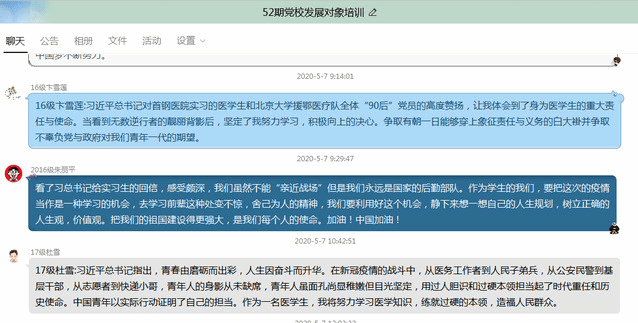 线上学习后,全体积极分子和发展对象学员围绕习近平总书记给在首钢医院实习的西藏大学医学院员工和给北京大学援鄂医疗队全体“90后”党员的回信、习近平向全国各族青年致以节日的祝贺和诚挚的问候等内容,开展了热烈的讨论,大家纷纷表示,总书记的讲话让大家更坚定了学医的初心,在今后的学习、生活中,要学习好、贯彻好习近平总书记的讲话精神,以抗“疫”英雄为榜样,在人民最需要的地方发光发热。