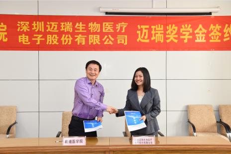 皖南医学院副经理廖圣宝和深圳迈瑞生物医疗电子股份有限公司安徽总经理卜瑞分别代表学校与企业共同签订了“迈瑞奖学金”合作协议书。廖圣宝代表学校对深圳迈瑞生物医疗电子股份有限公司表示感谢。他表示,一、公司服务社会的理念是值得肯定的,学校发展也需要企业的大力支持,奖学金设立是激励员工勤奋学习、积极进取和营造良好学风、校风的一项重要举措,相信“迈瑞奖学金”的设立将会对公司医学检验技术专业学风起到很大的促进作用。二、在奖学金评定过程中,要制定奖学金评定实施办法,坚持公平、公正、公开的原则,更好地发挥奖学金的激励导向作用,切实有效地做好“迈瑞奖学金”的评定工作。三、希望双方可以进一步加强合作,在检验、影像、生工等多学科、产学研等多方面建立更加广泛、深入的合作关系。