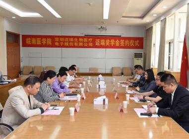 2017年5月11日上午,深圳迈瑞生物医疗电子股份有限公司设立的“迈瑞奖学金”签约仪式在皖南医学院行政会议室隆重举行,深圳迈瑞生物医疗电子股份有限公司安徽总经理卜瑞、深圳迈瑞IVD大区总经理桂标、安徽营销经理杨志、战略客户经理丁雷、市场部经理韩明君、皖南医学院副经理廖圣宝、员工处处长李军华、影检公司党委书记、副经理张建英、影检学院副经理许国飞、临床检验诊断学教研室主任浦春等参加了签约仪式。仪式由张建英主持。