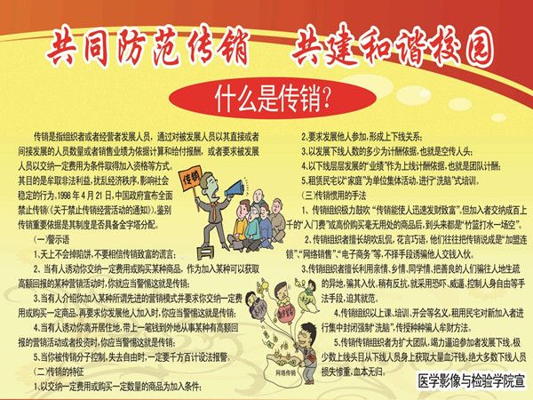 为了揭露传销的违法本质以及传销的巨大危害性,披露传销的骗人伎俩,强化同学们对传销的警觉意识,医学影像与检验学院通过QQ、宣传板等载体,广泛宣传反传销知识,避免老员工陷入传销的漩涡。