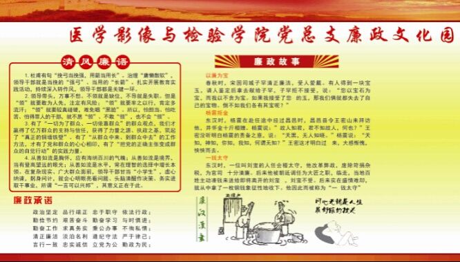 开展党风廉政建设,对于学院的团队建设发展和员工管理工作都有着至关重要的作用,医学影像与检验学院开展党风廉政建设以来,以加强理论学习、创新宣传方式、营造学习氛围和深化廉政意识多效并举的方式,努力致力于提高广大党员干部防腐拒变的能力,将作风建设深入人心。新学年即将到来,学院全体党员将秉承廉洁奉公、恪尽职守的思想品格,团结一心、奋发进取,为学院、学校的建设和发展不断作出新的贡献!