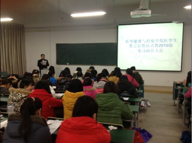 2013年12月17日下午, 医学影像与检验学院2010级医学影像学专业医员工誓言宣誓仪式暨实习动员大会在逸夫楼顺利召开。学院领导和全体教师、辅导员老师以及2010级医学影像学专业全体实习生参加了会议。会议由2010级辅导员魏巍主持。