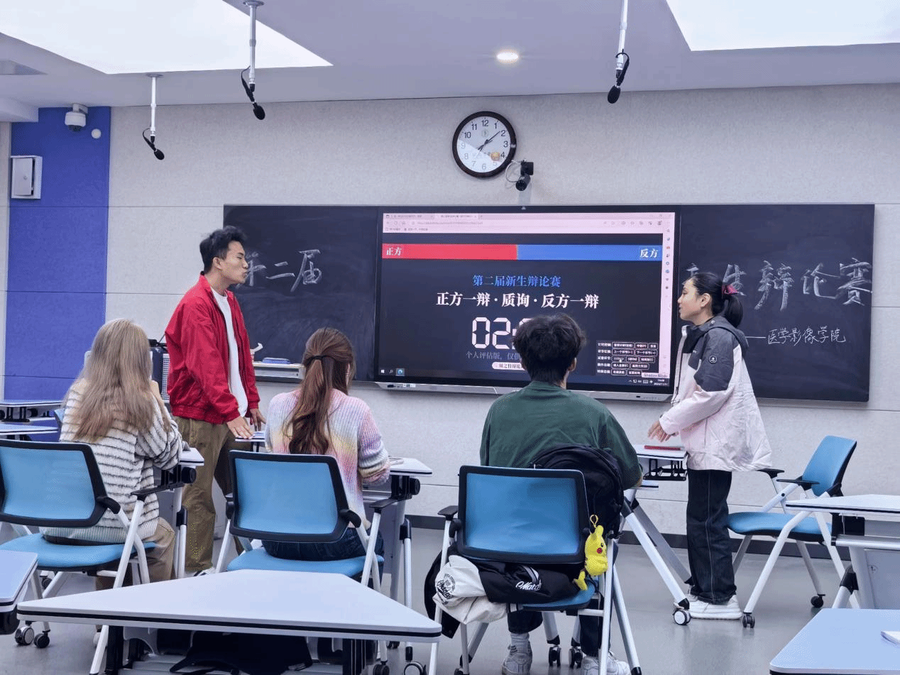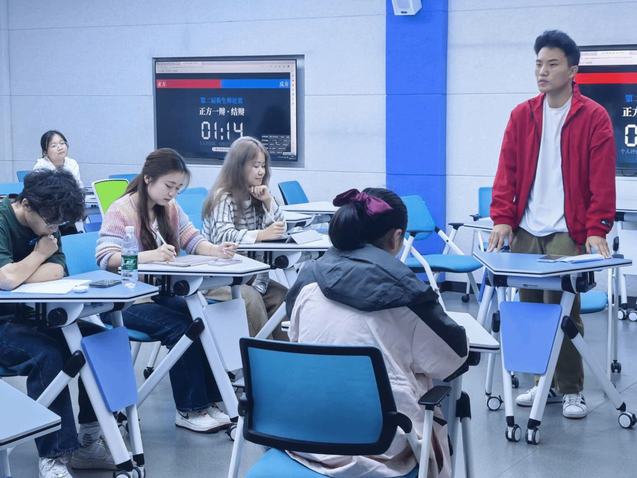 此次比赛有攻辩环节、自由辩论环节以及最后的总结陈词和提问点评环节。由评委提前公布选题,抽签决定正反方。正方一辩首先发言,阐述正方观点的定义、标准、主要论点和论据,反方随即做出精准有力的反驳。辩论现场。在激烈的辩论中,选手们充分展示了个人智慧和团队精神,双方侃侃而谈的自信气势与一针见血的发言论点为在场评委团与其他选手带来了一场精彩的视听盛宴。在自由辩论环节,双方选手利用自身扎实的理论基础,同时灵活地运用实际案例完善自己的论点,充分展示了对于辩论主题的深入思考。经过激烈的交锋,正反双方辩手均得到了实战锻炼,为接下来的校赛积累了经验。