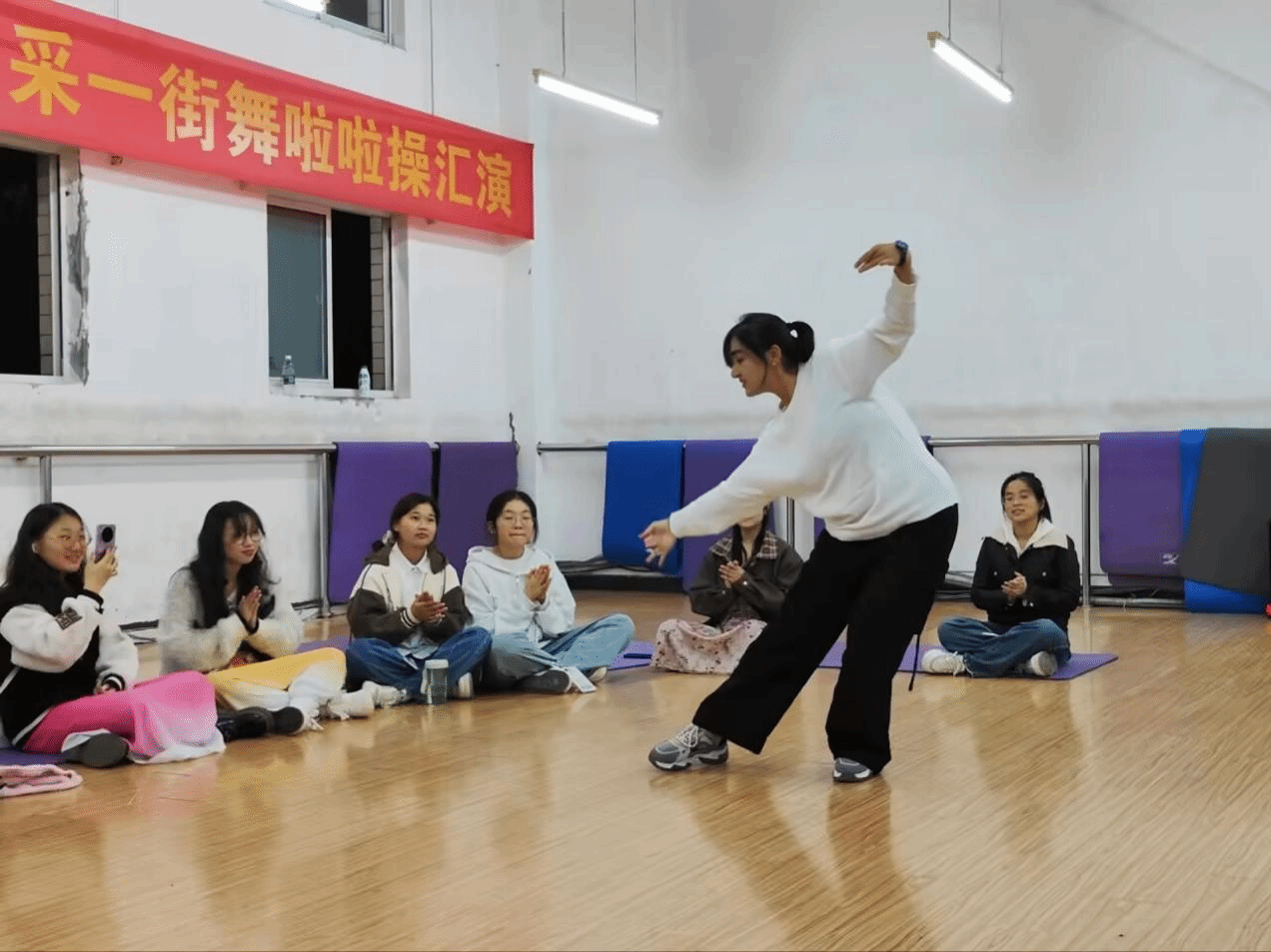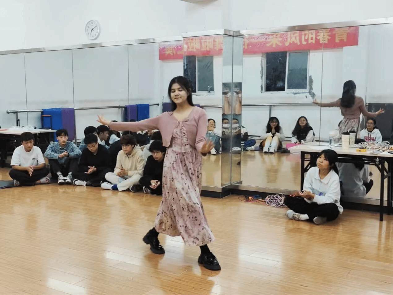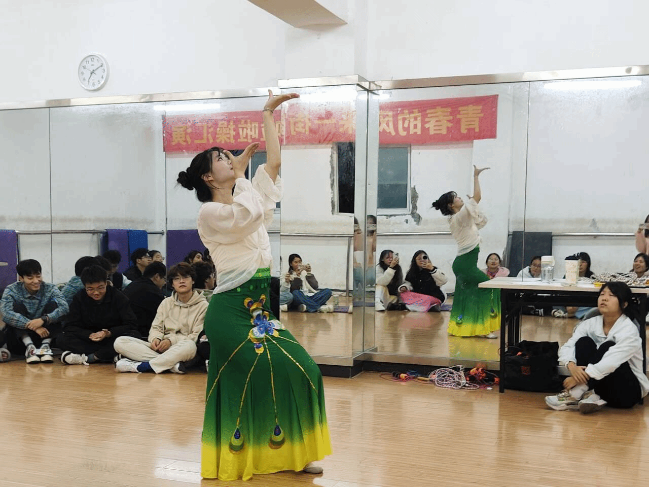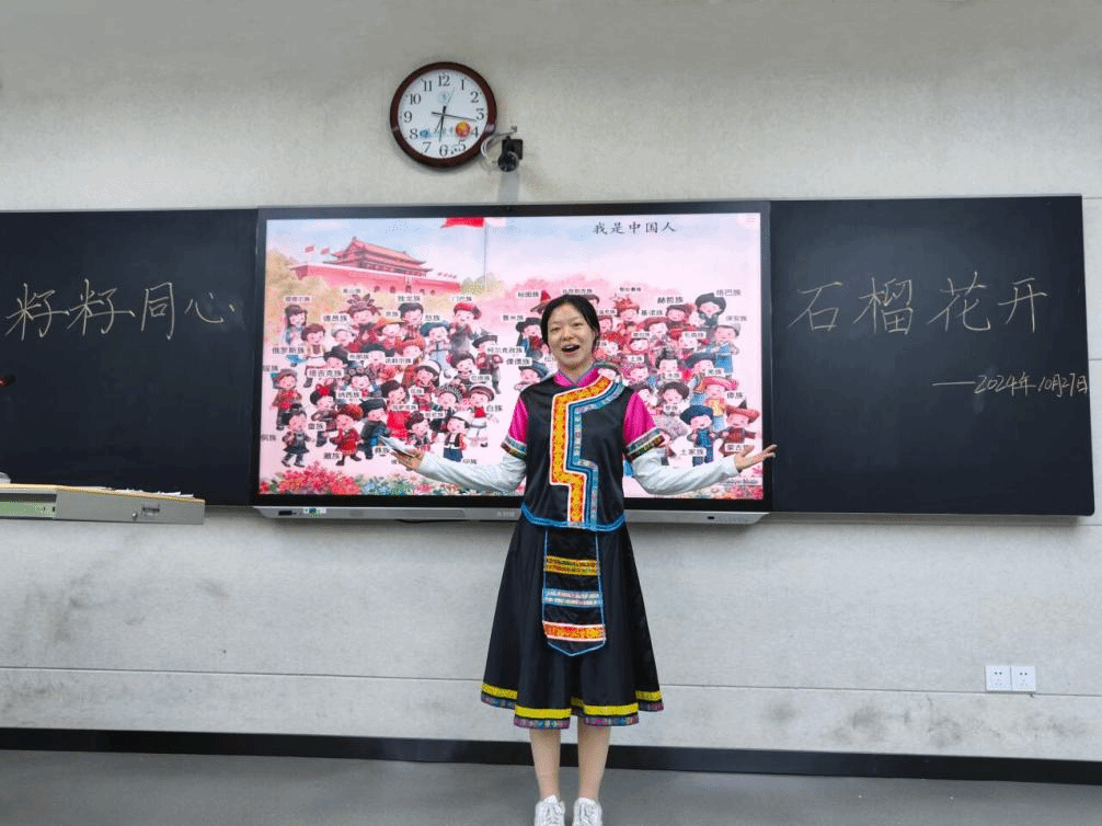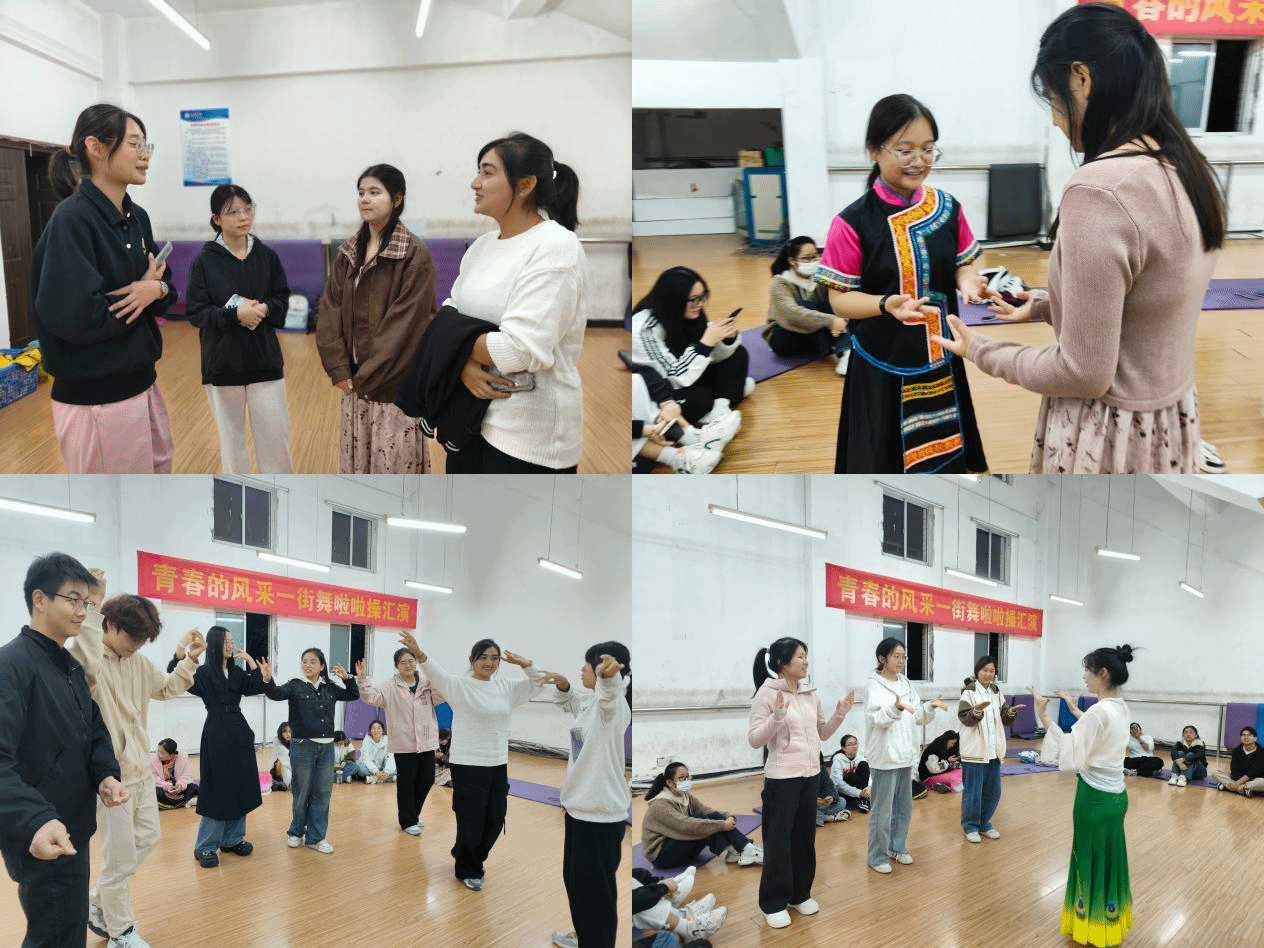 随着一阵阵悠扬动听的民族特色音乐响起,感受到这热闹非凡的氛围,同学们情不自禁地打起节拍。来自不同民族的同学纷纷走上舞台,展示着自己精心准备的舞蹈。有热情奔放、充满异域风情的新疆舞,有柔美灵动、轻盈飘逸的傣族舞,还有充满力量与韵律感的壮族舞,每一位舞者都以其独特的舞姿和魅力,展现出各民族别具一格的文化特色和艺术风采。此外,活动还特别设置了互动环节。在热情洋溢的氛围中,同学们跟随不同民族同学的指引,简单学习了富有特色的民族舞蹈动作。大家沉浸在欢快的节奏中,感受着民族舞蹈的独特韵律与魅力,不知不觉中更拉近了彼此之间的距离。