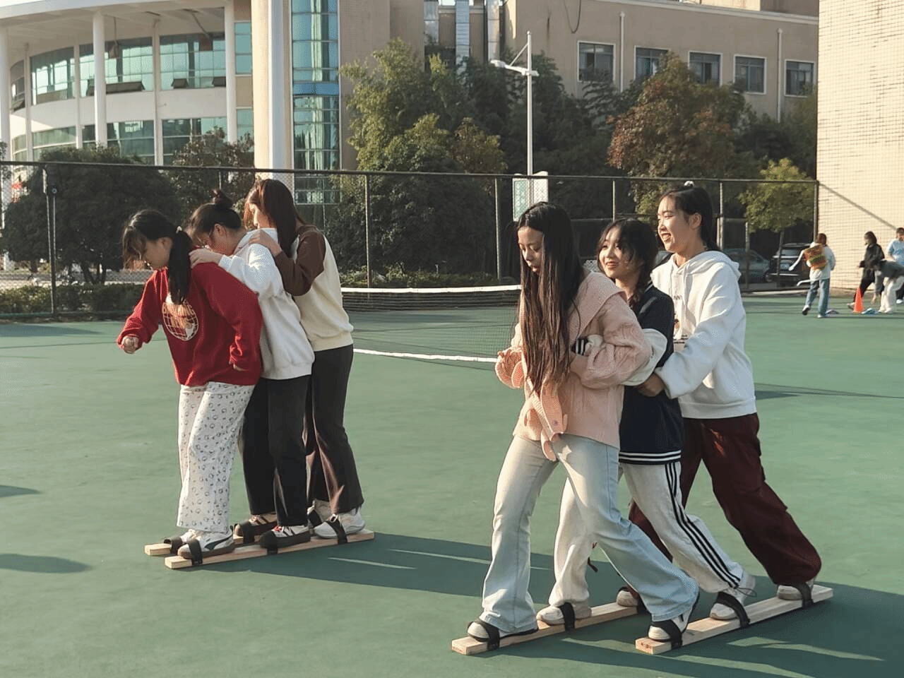 比赛规则宣读完毕,随着裁判员一声哨响,比赛正式开始,在“三人板鞋”赛道上,参赛者们三人一组,脚踏特制木板鞋,手指紧紧攥住队友的衣角,齐声喊着口号,步调一致地向终点迈进,该项目不仅考验了参赛者们的体能和技巧,更考验了他们之间的团队协作能力和默契配合度。现场你追我赶,场面紧张而激烈,观众们的加油声、欢呼声此起彼伏,将现场气氛推向了高潮。
