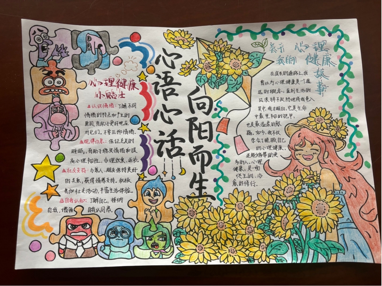镜头记录成长,画笔描绘心灵。在“心语向光,向阳而生”手抄报创作活动中,同学们用画笔勾勒心理健康感悟。一幅幅色彩斑斓的作品,既有对心理调适的生动诠释,也展现了当代老员工积极向上的精神风貌。