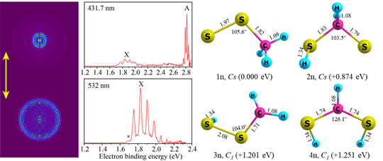 含硫自由基及其相关分子在生物体系中发挥着重要作用,其中二硫键结构广泛存在于蛋白质分子中,在维持蛋白质空间结构的稳定性以及调控生物氧化还原过程方面发挥关键作用。围绕含硫分子体系的电子结构特性,研究团队利用高分辨阈值光电子速度成像技术,结合高精度量子化学计算方法,对CH₃S₂的基态及低激发态电子结构开展系统研究。研究首次获得了该自由基精确的电子亲和能及振动激发态信息,并揭示了S-S键振动特征及相关电子态结构,为深入理解含硫自由基的电子结构特征及其反应性质提供了电子谱学依据。