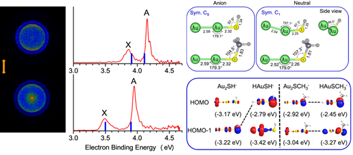 在另一项研究中,团队利用负离子光电子速度成像技术与理论计算方法,研究了硫醇配位保护的贵金属配合物[L-Au-SR]-(L = H、Au;R = H、CH3)的化学键特征。研究结果表明,Au2SR-体系在几何结构和前沿分子轨道方面与其氢类比体系HAuSR-表现出高度的相似性,从实验上进一步验证了金-氢类似性,并揭示配体结构对Au-S化学键共价性的调控机制。该研究为深入理解金-硫界面化学键的本质以及金纳米材料的结构调控提供了重要实验依据。