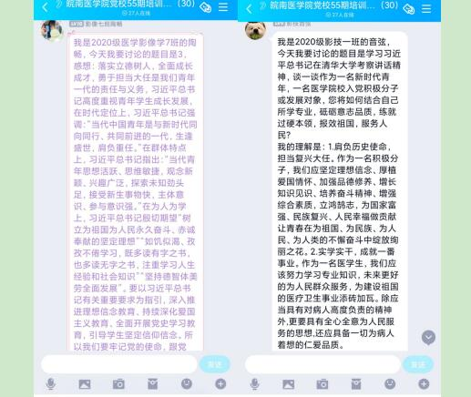 4月29日晚7点,在班主任组织下,各支部积极分子开展线上交流研讨。大家根据给定题目,有序发言,表达发出自己的观点想法。20级影像8班杜敏敏同学说:一名医学院校入党积极分子,更是应该掌握好专业知识,努力向党靠近。要坚持党的领导,努力学习科学文化知识,提高科学文化素养,关注时事,掌握时事,将自身能力与当下时代大背景结合起来,为国家富强的道路添砖加瓦,为人民幸福感的提升贡献力量。