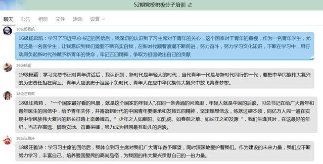 线上学习后,全体积极分子和发展对象学员围绕习近平总书记给在首钢医院实习的西藏大学医学院员工和给北京大学援鄂医疗队全体“90后”党员的回信、习近平向全国各族青年致以节日的祝贺和诚挚的问候等内容,开展了热烈的讨论,大家纷纷表示,总书记的讲话让大家更坚定了学医的初心,在今后的学习、生活中,要学习好、贯彻好习近平总书记的讲话精神,以抗“疫”英雄为榜样,在人民最需要的地方发光发热。