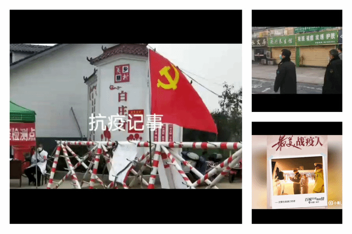 部分作品以坚守家乡社区、乡镇、医院等岗位的党员志愿者为对象,拍摄制作了他们日夜坚守岗位,履职尽责的工作场景。有乡镇党员同志在疫情防控工作中带头执勤,日日坚守卡点;有医护党员同志主动放弃与家人团聚、值守在当地疫情防控最前线;有社区党员同志主动要求支援抗疫,劝导疏散人群聚集。一段段短视频真实再现了各地各级党员同志的责任担当,凝聚起抗击疫情的钢铁长城。