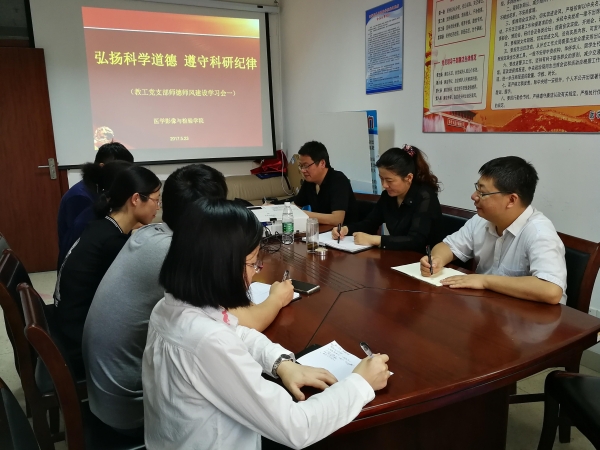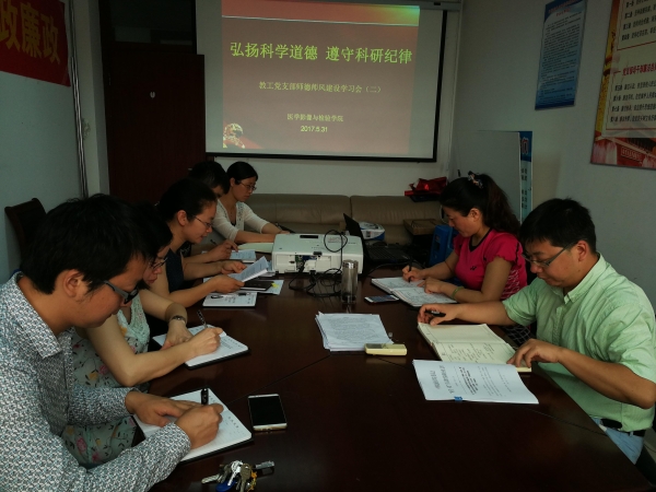 为了进一步加强教工党员师德师风建设,增强教师的责任意识,法律意识、纪律意识,医学影像与检验学院教工党支部积极开展主题为“弘扬科学道德 遵守科研纪律”的师德师德师风建设学习会,全体教职工党员参会。